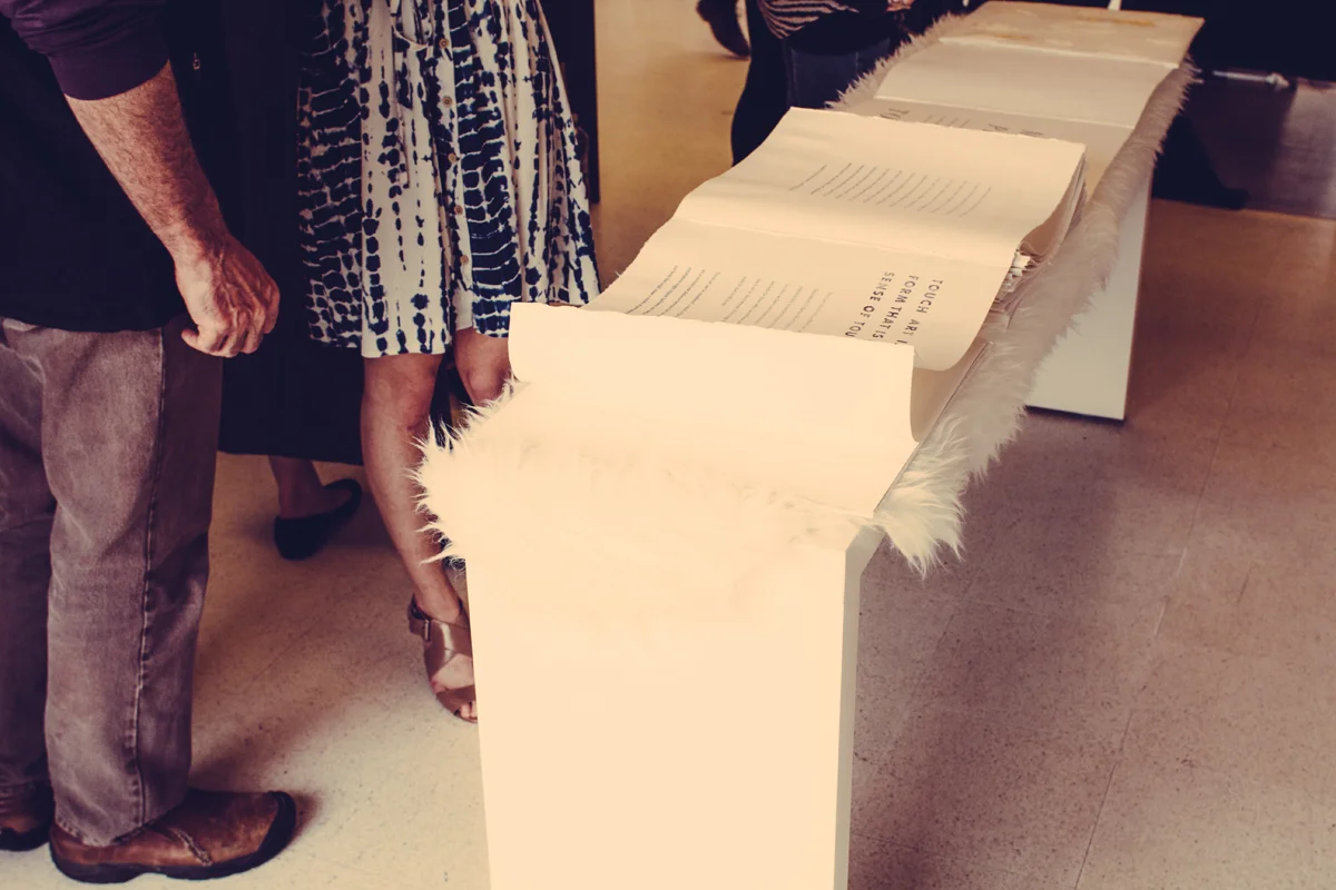 The first is a 15x15in. accordion bound book that incorporates print processes including silk screen, die cut, letterpress and xerox transfer. The second is a poster series, 3 large format posters that illustrate the words touch, haptic, and tactile. Each poster is printed on 22x30in. Arches paper. The definitions were then silk screened using heat sensitive ink, so the viewer will be able to reveal it's contents through touch.